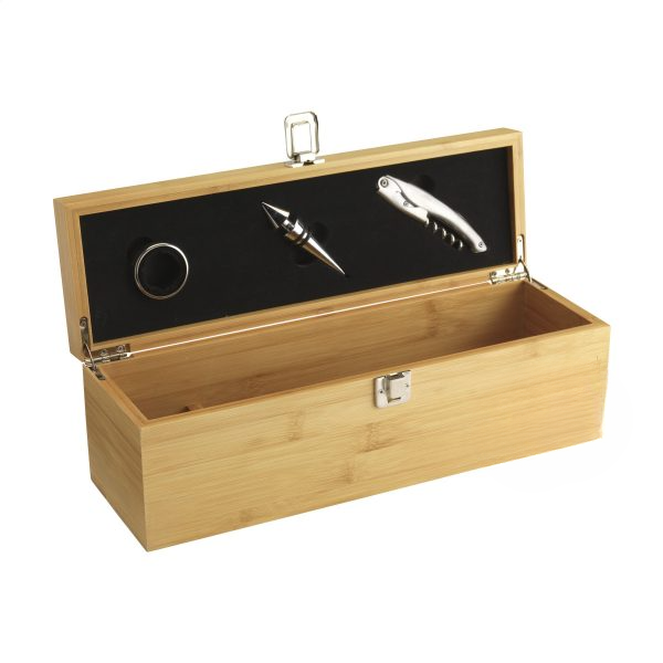Luxury wine box made of high-quality bamboo. With drop catcher, bottle stopper and stainless steel waiter’s knife. Excl. wine. Each set in a box.