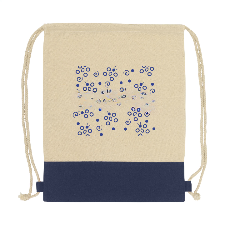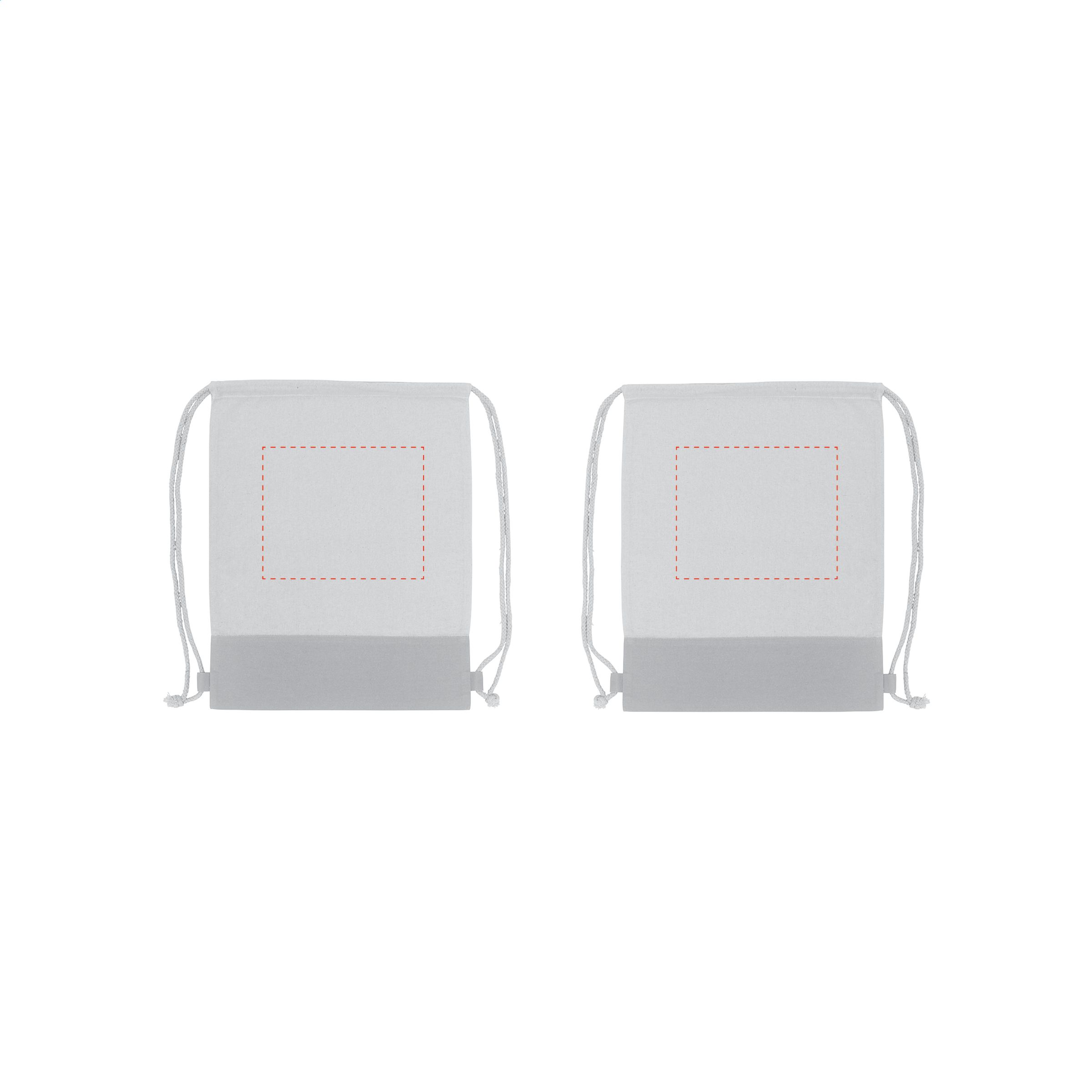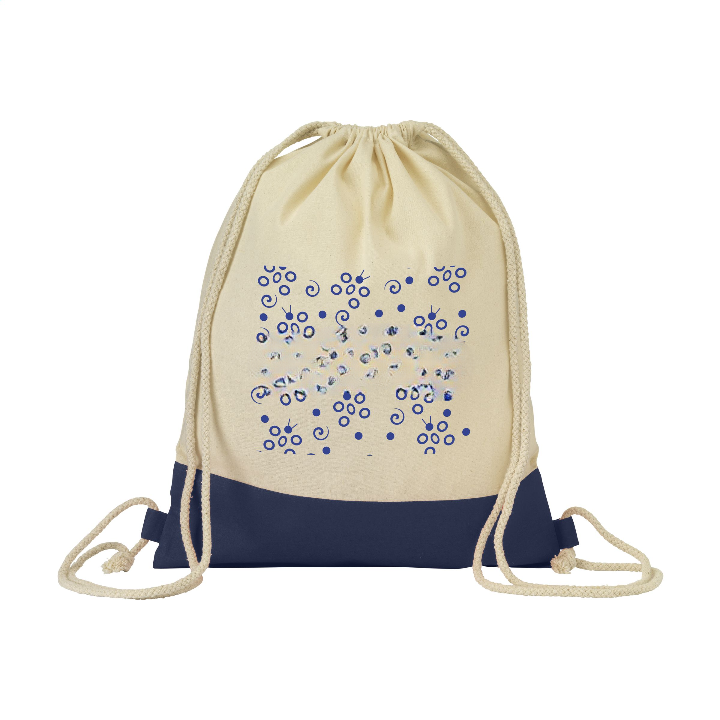 Backpack with drawstrings made of 100% cotton (140 g/m²) and a coloured inlay. Capacity approx. 8 liters.