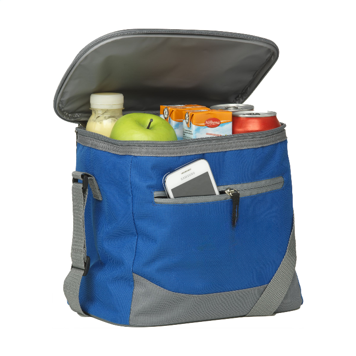 Cooler bag in handy format. Made of 600 D polyester. With large cooler compartmentl, front pocket with zipper, handle and adjustable shoulder strap. Suitable for 12 cans of drink.