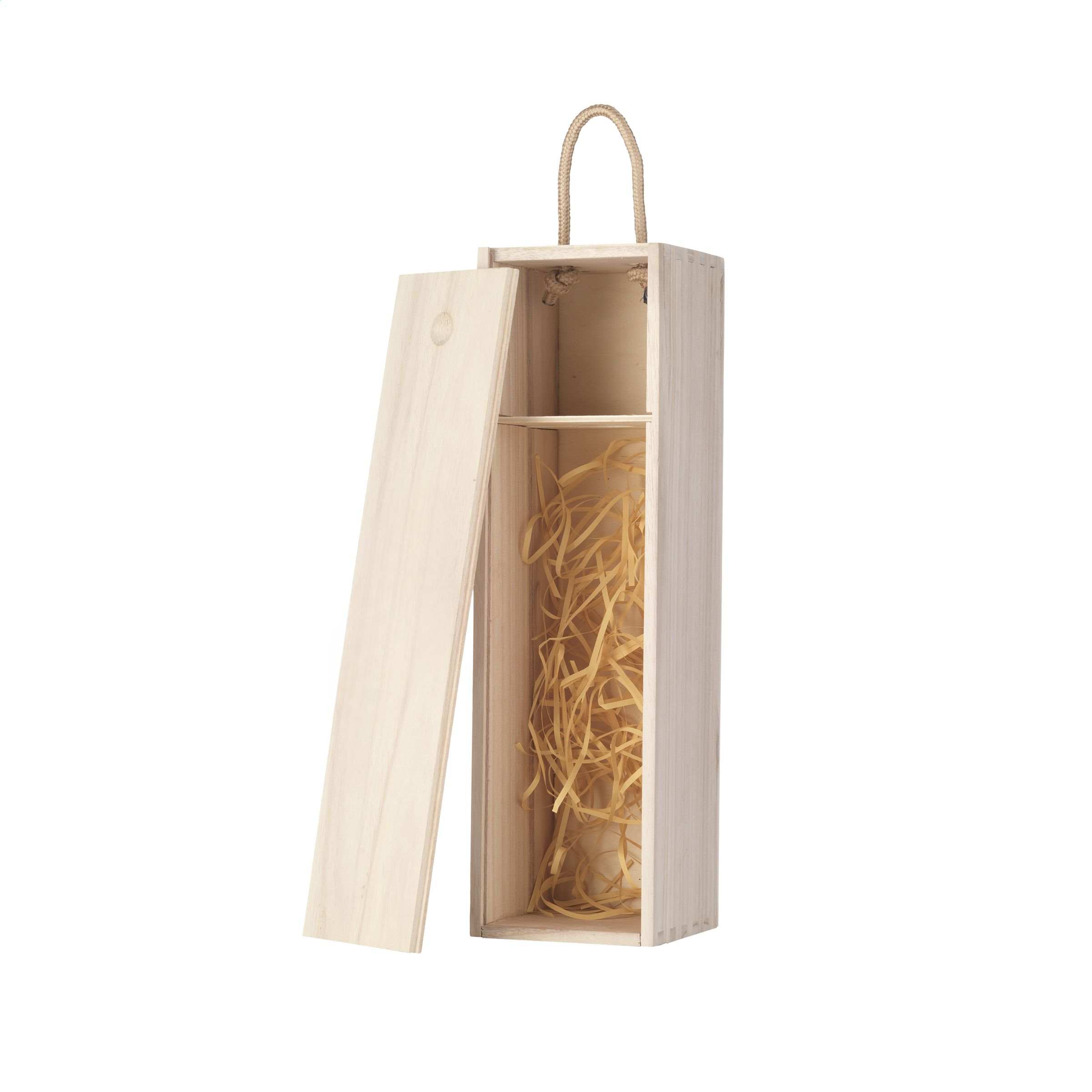 Wine box made of Paulownia wood. With sliding lid and cord. Suitable for 1 bottle of wine (0.75L). The wine box does not include wine. Each item is supplied in an individual brown cardboard box.