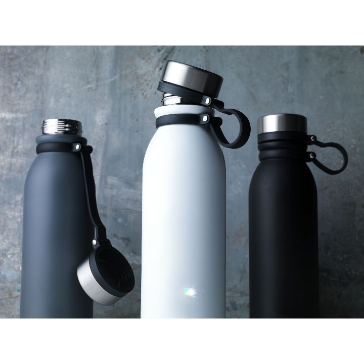 Double-walled, vacuum-insulated, leak-proof stainless steel water bottle/thermo bottle. The screw cap is attached to a rotatable silicon carrying strap and remains attached when the bottle is open, so you always have one hand free. Suitable for maintaining the temperature of cold or hot drinks. Capacity 600 ml. Each piece in a box.